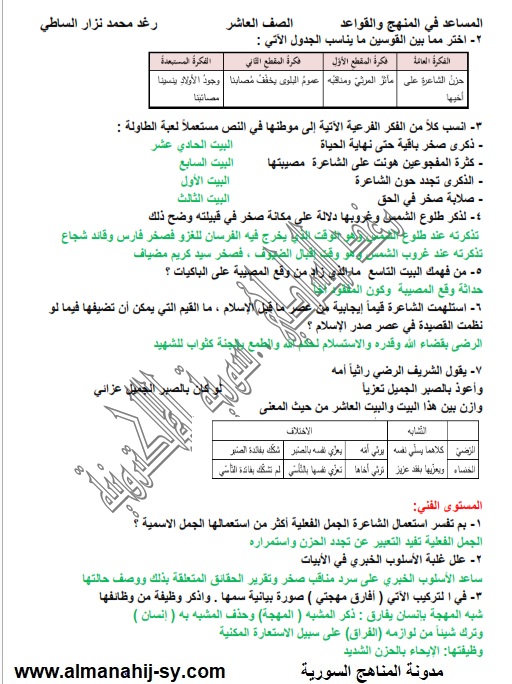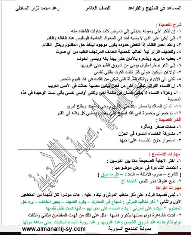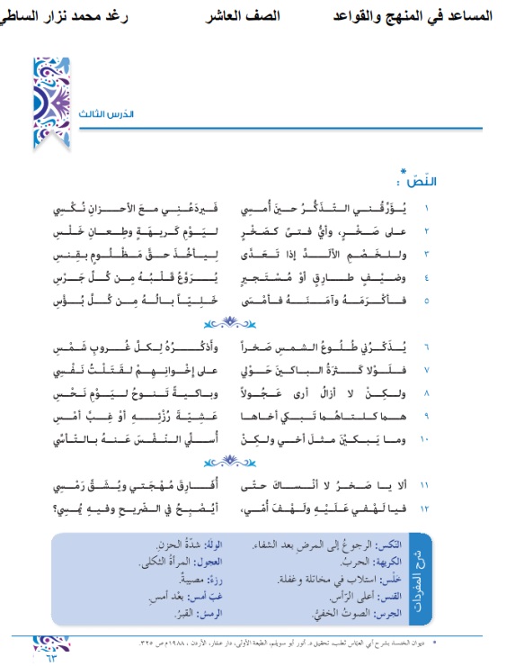 الصف العاشر عنوان الدرس قصيدة رثاء أخ الوافي صفحة المدر س أحمد إبراهيم الجاسم Facebook