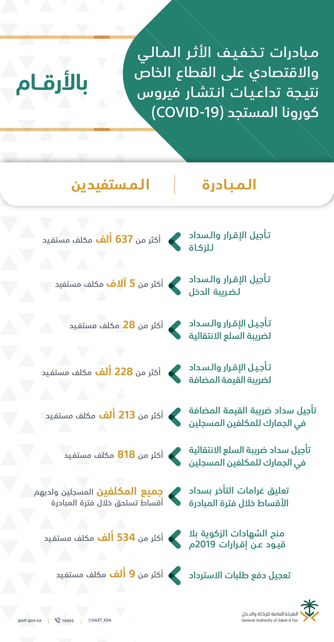 الهيئة العامة للزكاة والدخل בטוויטר أرقام المستفيدين من مبادرات الزكاة والدخل لتخفيف الأثر المالي والاقتصادي على القطاع الخاص نتيجة تداعيات انتشار فايروس كورونا المستجد Covid 19 Https T Co Bho4s06gpk